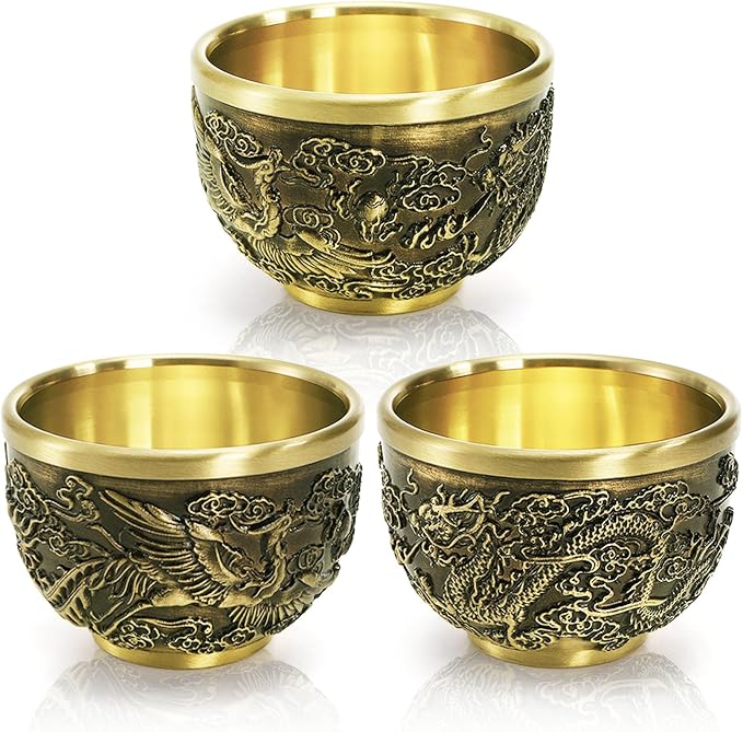 3 Pack Brass Tea Cup, Chinese Kung Fu Teacup with Dragon Phoenix Pattern, 3 Oz Asian Embossed Cocoa Coffee Mug Goblet for Drinking, Decor, Japanese Sake, Espresso